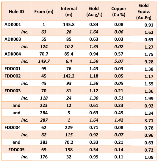 • 158m @ 0.72g/t gold equivalent (Au.Eq) (0.54g/t Au & 0.14% Cu), including 32m @ 1.09g/t Au.Eq (0.99g/t Au & 0.11% Cu) from drill hole FDD005