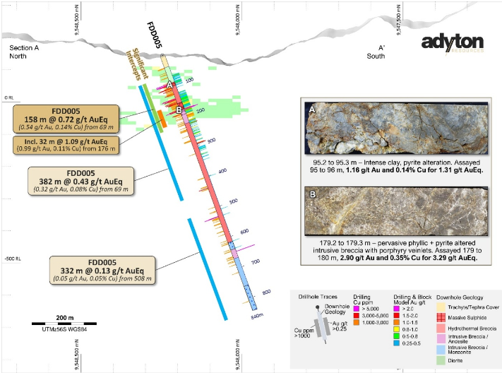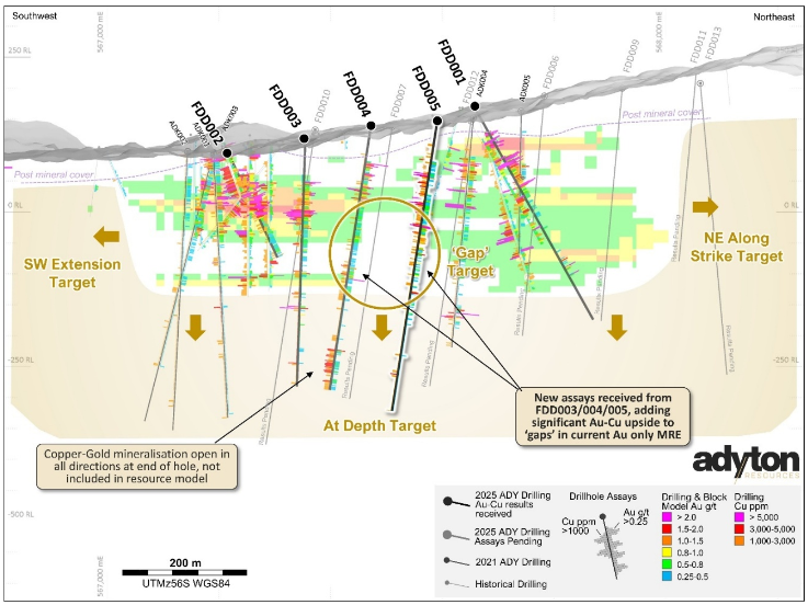 Brisbane, Australia – October 14, 2025 – Adyton Resources Corporation (TSX Venture: ADY) (“Adyton” or the “Company”) is pleased to report final assays from expansionary drill hole FDD005 at its 100% owned Feni Au-Cu project, Papua New Guinea. The results continue to confirm the significant scale of the Feni gold-copper mineral system, whilst also highlighting the challenges and opportunities of exploring a very large mineralized system that is under cover, particularly to target and intercept higher-grade gold-copper zones.