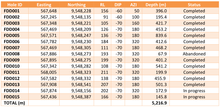 Table notes: FDD008 was abandoned at a shallow depth while still in post-mineral cover due to operational issues, redrilled as FDD009. FDD002 was terminated prematurely due to ground conditions while still in observed visual mineralisation. WGS 84 Zone 56S UTM coordinates.