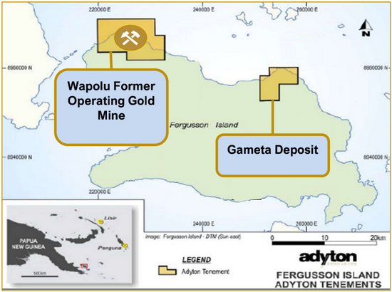 Adyton’s gold projects are on easily accessible island locations in PNG. The Gameta and Wapolu projects (in JV with EVIH) are located on Fergusson Island in the Milne Bay province of PNG which also hosts the Woodlark and Misima projects (see Figure 1 and refer to map of PNG deposits at end of document).