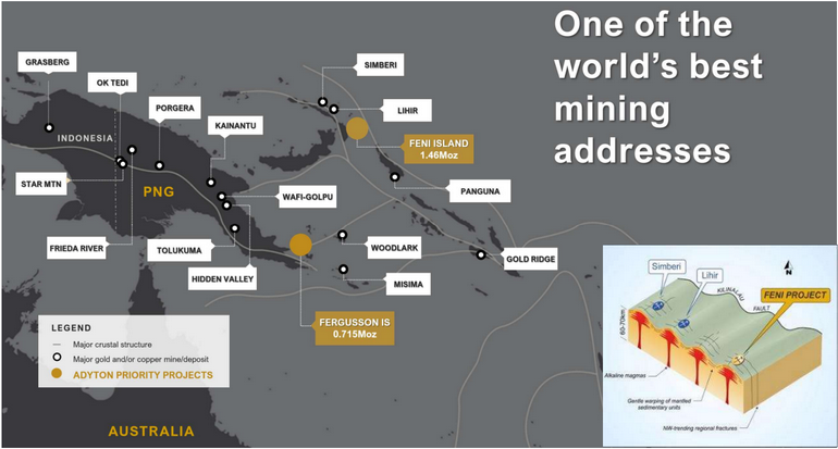 Adyton Resources Corporation is focused on the development of gold and copper resources in world class mineral jurisdictions. It currently has a portfolio of highly prospective mineral exploration projects in Papua New Guinea on which it is exploring to expand its identified gold Inferred and Indicated Mineral Resources and expand on its recent significant copper drill intercepts on the 100% owned Feni Island project. The Company’s mineral exploration projects are located on the Pacific Ring of Fire on easy to access island locations which hosts several globally significant copper and gold deposits including the Lihir gold mine and Panguna copper/gold mine on Bougainville Island, both neighboring projects to the Company’s Feni Island project.